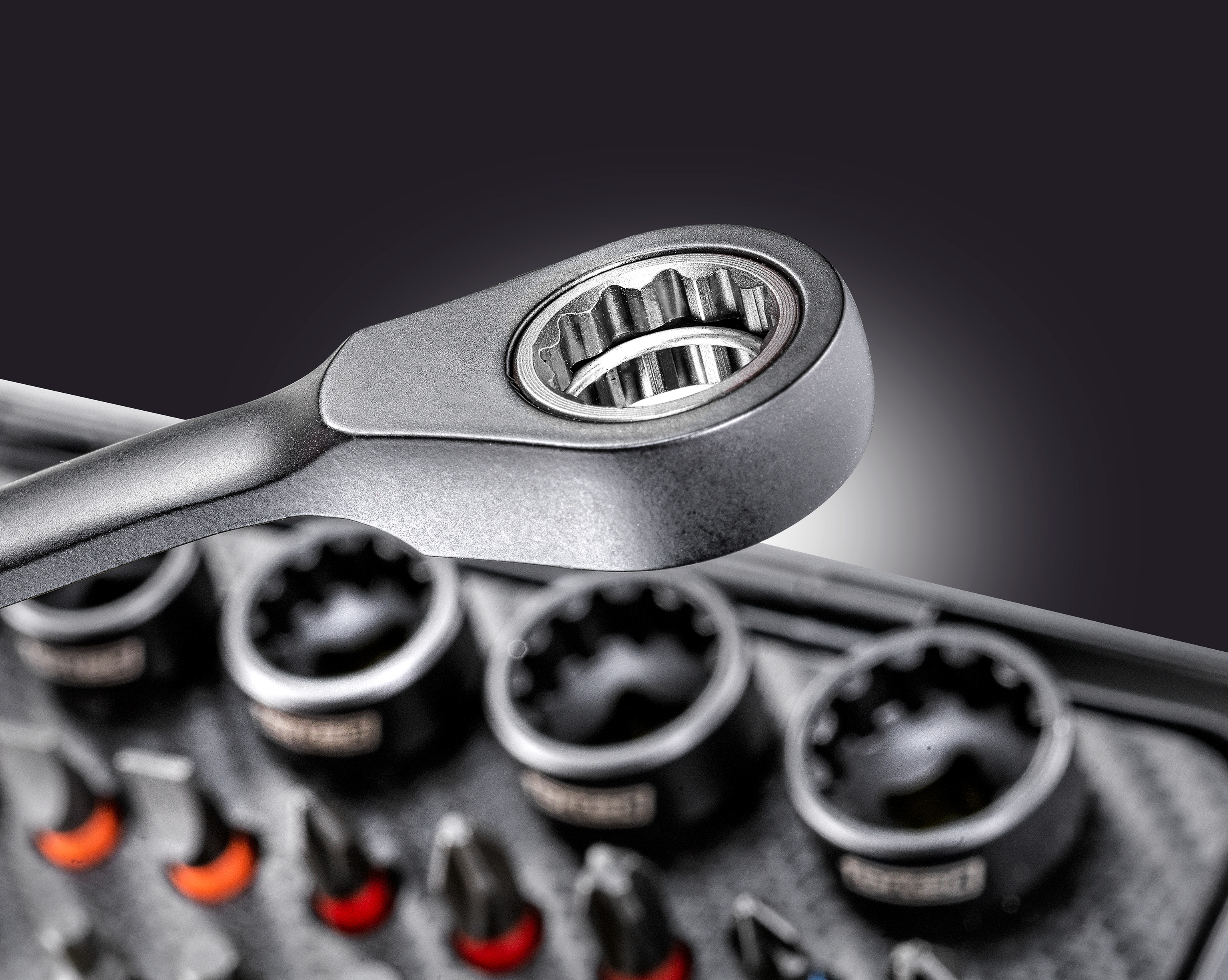 - Dank der speziell flachen Bauweise der Vielzahn-Steckschlüsseleinsätze und der Feinzahn-Umschaltknarre, sind selbst engste Platzverhältnisse kein Problem mehr