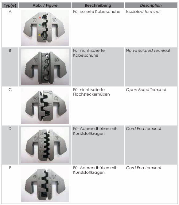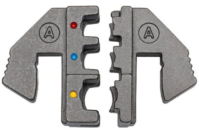 - Crimp-Einsatz A: für isolierte Kabelschuhe 0,5 – 6,0 mm2 (rot, blau, gelb)