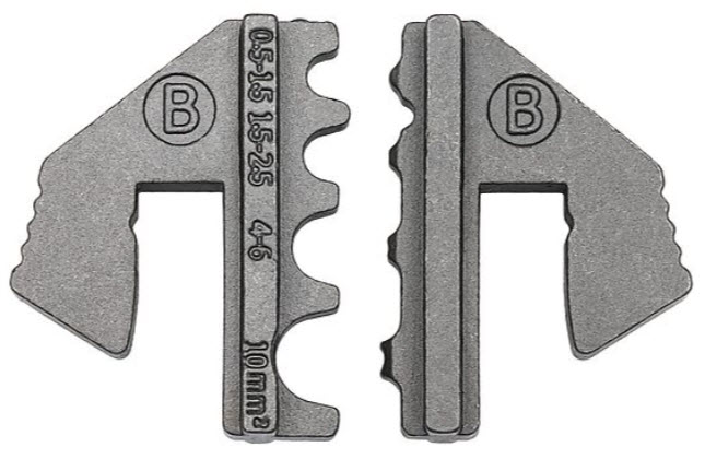 - Crimp-Einsatz B: für geschlossene, unisolierte Kabelschuhe 1,5 ∙ 2,5 ∙ 6,0 ∙ 10 mm2